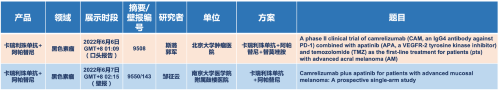 在黑色素瘤领域,永利娱乐城医药的卡瑞利珠单抗联合阿帕替尼(“双艾”组合)在2022 ASCO共入选1项口头报告和1项壁报展示。